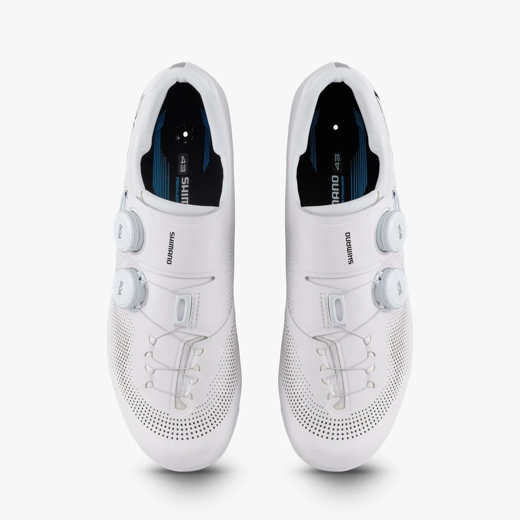 Shimano SH-RC703 jsou silniční cyklistické tretry zaměřené na výkon a komfort pro intenzivní tréninky i závodní podmínky. Tento model vychází z technologie S-PHYRE, která je známá u profesionálních treter Shimano a zajišťuje pevné obepnutí chodidla pro co nejlepší přenos síly. Hlavními přednostmi těchto treter jsou karbonová podrážka, která nabízí vysokou tuhost (index 10 na stupnici Shimano), a nízký profil podrážky, který snižuje vzdálenost mezi chodidlem a pedálem. To pomáhá maximalizovat efektivitu šlapání a udržet stabilitu během jízdy. Tretry mají prodyšný svršek z lehké syntetické kůže s perforacemi a vložky z TPU síťoviny, což podporuje ventilaci a pohodlí. Upínání zajišťuje systém BOA, umožňující rychlé a přesné nastavení.